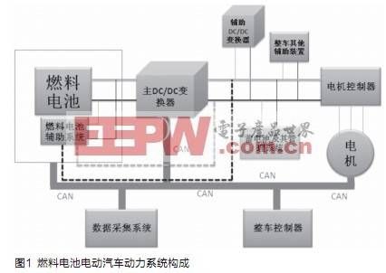 目前,燃料電池電動(dòng)汽車(FCEV)成為我國(guó)汽車科技創(chuàng)新主攻方向。燃料電池電動(dòng)汽車動(dòng)力系統(tǒng)主要由燃料電池發(fā)動(dòng)機(jī),DC/DC變換器,蓄電池,電機(jī)控制器(變頻器)及電機(jī),整車控制器,數(shù)據(jù)采集系統(tǒng)及CAN總線組成,如圖1所示。其中DC/DC變換器可以對(duì)燃料電池的輸出進(jìn)行控制及能量的傳遞與轉(zhuǎn)換,成為燃料電池電動(dòng)汽車關(guān)鍵零部件之一。在燃料電池電動(dòng)汽車運(yùn)行過(guò)程中,DC/DC變換器所處的電磁環(huán)境十分復(fù)雜,各種形式的電磁干擾很多,嚴(yán)重影響了DC/DC變換器的正常運(yùn)行。因此,研究FCEV用DC/DC變換器的電磁兼容性對(duì)DC/DC變換器乃至燃料電池電動(dòng)汽車的可靠運(yùn)行具有重要意義。