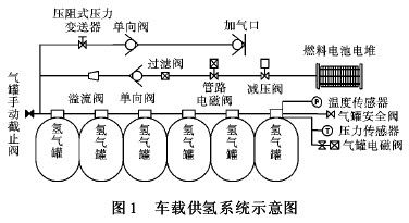 為了保證燃料電池汽車的安全穩(wěn)定運(yùn)行,需要設(shè)計(jì)一套安全有效的供氫系統(tǒng)。在燃料電池汽車上,供氫系統(tǒng)一般包括電磁閥、安全閥、溢流閥、熱熔栓、手動(dòng)截止閥、溫度傳感器和壓力傳感器等在內(nèi)的輔助安全裝置,其示意圖如圖 1 所示[9]。車載供氫系統(tǒng)安全措施應(yīng)從預(yù)防與監(jiān)控兩方面著手。從預(yù)防的角度來(lái)說(shuō),筆者以國(guó)內(nèi)研發(fā)的燃料電池中巴車為例,給出了車載供氫安全實(shí)例。