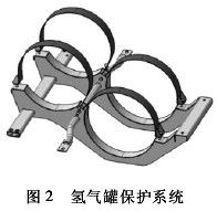 ( 2) 氫氣罐保護(hù)。高壓氫氣罐的固定支架和鋼帶應(yīng)有足夠的強(qiáng)度,以保證在碰撞過(guò)程中,高壓氫氣罐的動(dòng)態(tài)位移不會(huì)太大,避免造成連接管路的斷裂、變形和氫氣的大量泄漏。何?。?3]基于顯式有限元理論,按照 CMVDR294 法規(guī)對(duì)國(guó)內(nèi)自主開發(fā)的某燃料電池轎車進(jìn)行正面碰撞分析,對(duì)比分析兩種氫氣罐保護(hù)系統(tǒng)設(shè)計(jì)方案的計(jì)算結(jié)果,提出了安全有效的氫氣罐保護(hù)方案,即氫氣罐保護(hù)系統(tǒng)采用整體式設(shè)計(jì)。如圖 2 所示,氫氣罐框架通過(guò) 3 根橫梁和 2 根縱梁將兩個(gè)氫氣罐集成到一個(gè)框架總成??v梁截面為“Π”形,由幾塊板材拼焊而成,中部設(shè)計(jì)出兩個(gè)圓弧形凹槽,可以對(duì)氫氣罐進(jìn)行有效的固定和保護(hù)。