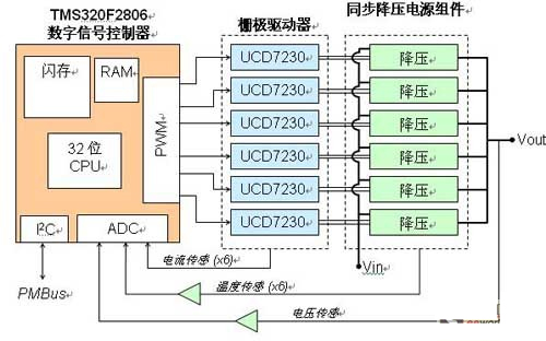 TI推出的32位TMS320F2806數(shù)字信號控制器(DSC)運行在100MHz頻率下,并且以電源應(yīng)用為目標(biāo)。在本例中,其在軟件中實施電壓模式控制,該軟件使用一個在PWM開關(guān)頻率上進行采樣的單通道2極點2零點數(shù)字補償器。隨后產(chǎn)生的占空比值將被傳給每一個降壓相(所有為實現(xiàn)相位平衡所作的占空比調(diào)節(jié)除外)。通過使用片上12位模數(shù)轉(zhuǎn)換器(ADC)獲得系統(tǒng)輸出電壓反饋。MOSFET溫度在整個ADC中均為可用,以實現(xiàn)監(jiān)控的目的,并且片上內(nèi)部集成電路(I2C)端口提供了對PMBus™通信的支持。針對同步降壓應(yīng)用專門設(shè)計了一款UCD7230柵極驅(qū)動器,從而提供了采用TITrueDrive™輸出架構(gòu)的雙通道4-AMOSFET驅(qū)動器、周期性電流限制以及一個內(nèi)置低失調(diào)、高增益、差分電流傳感放大器。