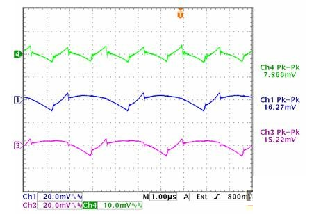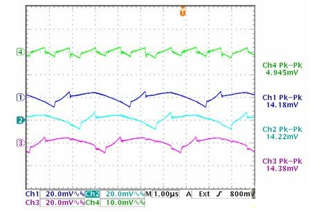 圖2a顯示了一款120°交錯式(條件:10V輸入、2V輸出、3A負載及300kHzPWM開關(guān))PWM結(jié)構(gòu)的三相交錯式降壓轉(zhuǎn)換器的示波器屏幕采集圖。示波器通道1至3顯示的是單個相位電壓,而通道4顯示的是交錯式輸出電壓(所有示波器通道均為AC耦合)。通過所有運行中的三個相位,可以得出該輸出紋波為4.9mV(輸出電壓的0.25%)。在沒有調(diào)整兩個剩余相位(見圖2b)角的情況下,切除相位2會引起輸出紋波增加86%,即為9.1mV。為了獲得180°交錯(見圖2c),對兩個剩余相位進行軟件調(diào)整以后,該紋波減少至7.9mV。在仍然比初始值大的同時(因為一個兩相位系統(tǒng)無法獲得如一個三相系統(tǒng)一樣的低紋波),其比未被調(diào)整的剩余相位角提高了13%。