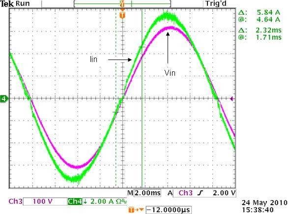 圖5:低壓線路的VIN和IIN波形(VIN=110V,負(fù)載=1100W,THD=2.23%,PF=0.998)
