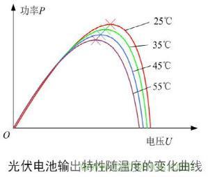 在一定的光照強度和環(huán)境溫度下,光伏電池可以工作在不同的輸出電壓,但是只有在某一輸出電壓值時,光伏電池的輸出功率才能達到最大值,這時光伏電池的工作點就達到了輸出功率電壓曲線的最高點,稱之為最大功率點。如圖2所示為MPPT受光照影響圖、圖 3所示為MPPT受溫度影響圖
