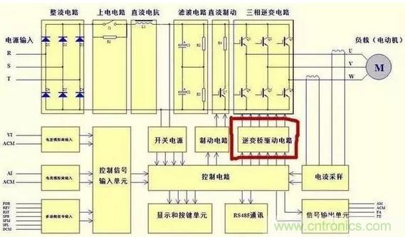 IGBT逆變電路由6個IGBT組成,直流制動電路則是在負載電動機因超速產(chǎn)生發(fā)電時,提供電動機的發(fā)電電能向直流制動電路的回饋通路,起到電動機制動的作用。(小功率的機型往往內(nèi)置制動電路,大功率的機型則選擇外接制動電路)