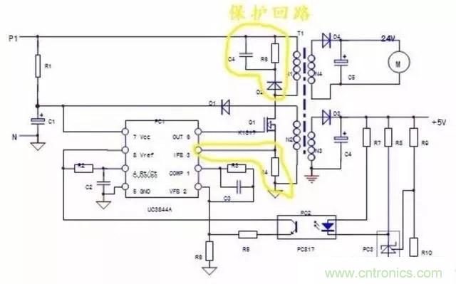 3)保護回路:PC1芯片本身和3腳外圍元件R4構(gòu)成過電流保護回路;N1繞組上并聯(lián)的D2,R6,C4元件構(gòu)成了開關管的反壓吸收保護電路;實質(zhì)上穩(wěn)壓回路的電壓反饋信號——穩(wěn)壓信號,也可看作一路電壓保護信號,但保護電路的內(nèi)容并不僅是局限于保護電路本身,保護電路的啟控往往是由于負載電路異常所引起的。