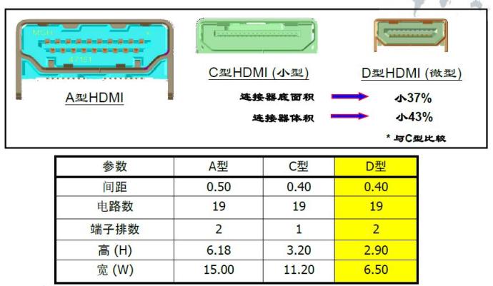 據(jù)介紹,D型HDMI連接器主要技術參數(shù)包括:0.4mm間距I/O(輸入/輸出)用于PCB到電纜;2排端子,19條電路;拔插耐用次數(shù)5000次;連接器的尺寸(插座),6.5mm寬,2.9mm高。