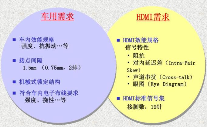 車用連接系統(tǒng)是專為車內高清內容傳輸所設計的布線規(guī)格。HDMI1.4規(guī)格所設計的解決方案,可處理車內布線所面臨的高溫、振動、噪音等各種問題與環(huán)境因素。車用連接系統(tǒng)是汽車生產商在設計車內高清內容傳輸時一個極有效的解決方案。