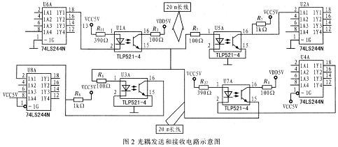 在長線傳輸中,正是因?yàn)榈鼐€的交流阻抗特性,使得地線成了電路中事實(shí)上的最大噪聲源。地線造成干擾的主要原因是地線存在阻抗,當(dāng)電流流過地線時(shí),會(huì)在地線上產(chǎn)生電壓,這就是地線噪聲。在這個(gè)電壓的驅(qū)動(dòng)下,會(huì)產(chǎn)生地線環(huán)路電流,形成地環(huán)路干擾。南于發(fā)送和接收設(shè)備共用一段地線,會(huì)形成公共阻抗耦合。采用光電隔離器TLP521-4對(duì)發(fā)送和接收設(shè)備進(jìn)行電氣隔離,對(duì)于減小交流阻抗的作用十分明顯,進(jìn)而增大傳輸電流,有效地抑制地線噪聲;同時(shí)由于74LS244N的應(yīng)用??偩€驅(qū)動(dòng)能力得到保障。圖2為光耦發(fā)送和接收電路示意圖。圖2中,上半部兩光耦自左向右傳輸信號(hào),下半部兩光耦自右向左傳輸信號(hào),左端74LS244N通過靜態(tài)存儲(chǔ)器IDT7132與處理器進(jìn)行數(shù)據(jù)交換,右端通過8255與處理器進(jìn)行數(shù)據(jù)交換。