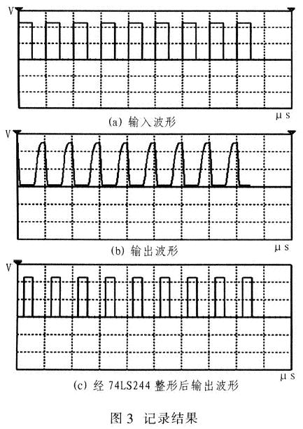 調(diào)試中,輸入周期為100μs,占空比為1/2的+5V方波,對(duì)一路光耦的輸入端波形和經(jīng)過20m長線后接收光耦的輸出端波形以及經(jīng)過74LS244整形后的波形進(jìn)行記錄。記錄結(jié)果如圖3所示。