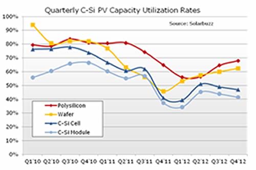 而對(duì)于一些第三季度還曾開足馬力生產(chǎn)的上游廠商來說,終端安裝量的激增并沒有全部轉(zhuǎn)化為新增訂單,出貨受阻導(dǎo)致三季度末庫存周轉(zhuǎn)天數(shù)不減反增,因此在第四季度堅(jiān)決調(diào)低了產(chǎn)能利用率。晶硅電池和組件制造環(huán)節(jié)在第四季度的平均產(chǎn)能利用率僅為四成左右,預(yù)計(jì)在2012年一季度還將維持在這一水平附近,二季度開始則會(huì)出現(xiàn)回升。