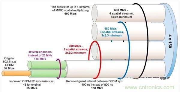 搜各種百科資料IEEE802.11詞條,我們可以讀到,從802.11n開始,數(shù)據(jù)傳輸速率或者說承載的數(shù)據(jù)量有了很大的提升。首先,802.11n有了40MHz模式,然而按照之前的理論,它的發(fā)射范圍應(yīng)該因此降低一半才對,但事實上數(shù)據(jù)反而提升了一倍(70m),這又是怎么一回事?