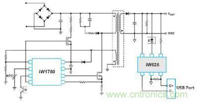 典型的手機充電器的硬件結構(以基于Dialog方案的高通QC2.0快充協(xié)議為例)如圖 1所示。iW626作為QC2.0協(xié)議控制器,經(jīng)由USB口的D+/D-信號和手機側AP進行供電協(xié)商,然后通過光耦控制原邊的AC/DC控制器iW1780完成輸出電壓的調整。