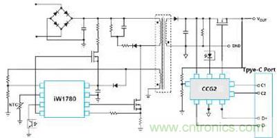 基于PD協(xié)議的充電器電路可以維持AC/DC部分不變,只是將QC協(xié)議控制器替換為PD控制器[1],比如Cypress半導體的CCG2(Type-C Controller Generation 2). CCG2 是最早通過USB-IF認證的PD控制器之一,內部包含ARM® Cortex®-M0處理器和完備的PD協(xié)議收發(fā)器,可以滿足充電器,主機,附件,EMAC線纜等各種支持Type-C口的應用,在蘋果,聯(lián)想,HP,Dell,小米,樂視等一線品牌客戶都有眾多的量產(chǎn)案例。