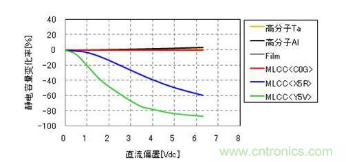 直流偏置特性是指,對電容器施加直流電壓時(shí)實(shí)際靜電容量發(fā)生變化(減少)的現(xiàn)象。這種現(xiàn)象是使用了鈦酸鋇系鐵電體的高介電常數(shù)類片狀多層陶瓷電容器特有的現(xiàn)象,導(dǎo)電性高分子的鋁電解電容器(高分子AI)和導(dǎo)電性高分子鉭電解電容器(高分子Ta)、薄膜電容器(Film)、氧化鈦和使用了鋯酸鈣系順電體的溫度補(bǔ)償用片狀多層陶瓷電容器(MLCC