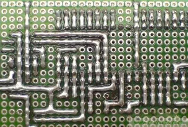 網(wǎng)上還流行一種方法叫錫接走線法,如下圖所示,工藝不錯,性能也穩(wěn)定,但比較浪費錫。純粹的錫接走線難度較高,受到錫絲、個人焊接工藝等各方面的影響。如果先拉一根細(xì)銅絲,再隨著細(xì)銅絲進(jìn)行拖焊,則簡單許多。洞洞板的焊接方法是很靈活的,因人而異,找到適合自己的方法即可。