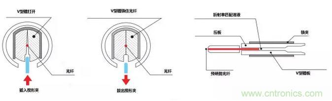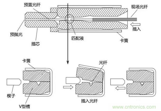 光纖快速連接器/冷接子可分為預(yù)置光纖和非預(yù)置光纖兩大類。預(yù)置光纖快速連接器/冷接子的接續(xù)點(diǎn)在連接器內(nèi)部,并預(yù)置有匹配液;非預(yù)置光纖快速連接器/冷接子的接續(xù)點(diǎn)在連接器表面,不預(yù)置匹配液,直接通過(guò)適配器與目標(biāo)光纖對(duì)接。非預(yù)置光纖快速連接器/冷接子的工作原理很簡(jiǎn)單,這里不做贅述。下面詳細(xì)說(shuō)明預(yù)置光纖快速連接器/冷接子的原理:如下圖所示,預(yù)置光纖膠接在插芯中,接續(xù)點(diǎn)設(shè)在放有折射率近似纖芯的導(dǎo)光材料-匹配液的V型槽中,從而實(shí)現(xiàn)預(yù)置光纖和目標(biāo)光纖的無(wú)縫貼合。