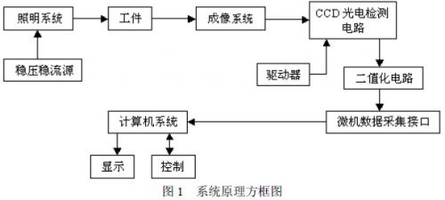 整個檢測系統(tǒng)由照明系統(tǒng)、被測工件系統(tǒng)、成像物鏡、CCD 光電檢測系統(tǒng)和計算機(jī)測控系統(tǒng)(8031 單片機(jī)和8279 鍵盤/顯示芯片等)構(gòu)成。穩(wěn)壓穩(wěn)流調(diào)光電源為遠(yuǎn)心照明系統(tǒng)提供穩(wěn)定的照明光,被照明的工件經(jīng)成像物鏡成像在線陣CCD 的光敏陣列面上。由于工件不透光,工件的像在中間部分形成暗帶,兩側(cè)形成亮帶。 暗帶的寬度就是工件尺寸所成像的大小。線陣CCD 在驅(qū)動脈沖的作用下完成光電轉(zhuǎn)換并產(chǎn)生視頻信號。其系 統(tǒng)原理圖如圖1。