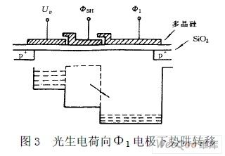 如圖3 所示,MOS 電容中的信號電荷包通過轉(zhuǎn)移柵轉(zhuǎn)移到模擬移位寄存器的Φ1 電極下的勢阱中。當(dāng) ΦSH 由高變低時,ΦSH 低電平形成的淺勢阱將存儲柵下勢阱與Φ1 電極下的勢阱隔離開。存儲柵勢阱進(jìn)入光 積分狀態(tài),而模擬移位寄存器將在Φ1 與Φ2 脈沖的作用下驅(qū)使轉(zhuǎn)移到Φ1 電極下勢阱中的信號電荷向左轉(zhuǎn)移, 并經(jīng)輸出電路由OS 電極輸出。由于結(jié)構(gòu)上的安排,OS 端首先輸出13 個虛設(shè)單元信號,再輸出51 個暗信號, 然后才連續(xù)輸出S1 到S2160 的有效像素單元信號。第S2160 信號輸出后,又輸出9 個暗信號,再輸出2 個奇 偶檢測信號,以后便是空驅(qū)動??镇?qū)動數(shù)目可以是任意的。由于該器件是兩列并行分奇、偶傳輸?shù)?,所以?一個ΦSH 周期內(nèi)至少要有1118 個Φ1 脈沖,即TSH>1118T1。ΦR 為復(fù)位級的復(fù)位脈沖,復(fù)位一次輸出一個 信號。