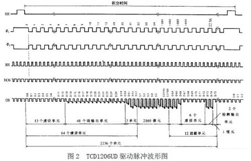 (1)工作原理。 TCD1206UD 在圖2 所示的驅(qū)動脈沖作用下工作。當(dāng)ΦSH 脈沖的高電平到來時,正值Φ1 電極下均形成深勢阱,同時ΦSH 的高電平使Φ1 電極下的深勢阱與MOS 電容存儲勢阱溝通。