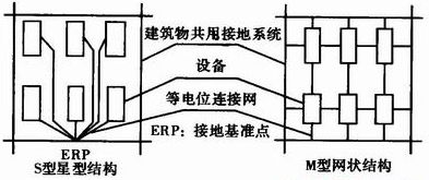 (4)等電位保護。電子設備的機柜機架、金屬外殼、金屬管槽、屏蔽線纜外層、信息設備的防靜電接地端、安全保護接地端、浪涌保護接地端等,在同等電位連接網(wǎng)絡的接地端子相連接時,均需采用最短的距離??刂葡到y(tǒng)的等電位連接,通常分為“S型星型結構”以及“M型網(wǎng)狀結構兩種”,其中在控制系統(tǒng)中設備較少或者進行局部控制時通常采用S型星型結構,而在相對較大的控制系統(tǒng)中則采用M型的網(wǎng)狀結構。等電位連接的基本方式如圖3所示。