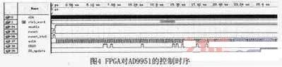 在本系統(tǒng)中,我們基于直接數(shù)字頻率合成(DDS)技術(shù)進行信號產(chǎn)生。DDS的實現(xiàn),使用芯片AD9951。AD9951是一個可控的頻率合成芯片,具有32位頻率轉(zhuǎn)換字,最大合成頻率為160MHz。系統(tǒng)中采用兩塊AD9951,分別產(chǎn)生主振信號和本振信號。FPGA通過該芯片的控制端口,對其產(chǎn)生的信號頻率進行控制。其控制時序如圖4所示。