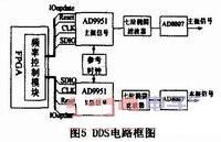 頻率信號產(chǎn)生電路在FPGA中頻率控制模塊的控制下,產(chǎn)生高精度正弦主振信號和本振信號,分別用于光調(diào)制和混頻。此電路產(chǎn)生的信號要求頻率可調(diào),且具有高的頻率穩(wěn)定性和低的相位噪聲,相位抖動小,以保證最終的測量精度。
