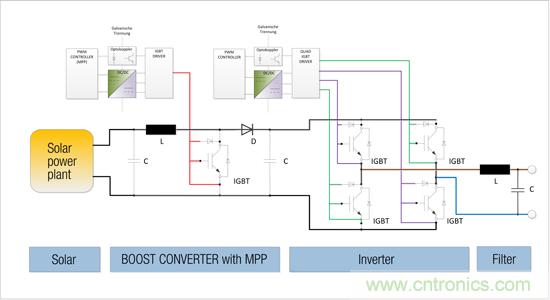 Fig. 1: Functional diagram of a solar power plant with boosters and inverters (top). Each IGBT driver is supplied through a well-isolated DC/DC converter.The device is controlled by means of a high-frequency PWM signal whose output is smoothed to a sine wave (left).