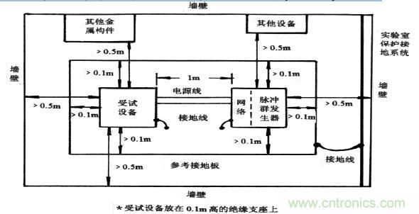 ① 試驗(yàn)應(yīng)在試驗(yàn)室中央進(jìn)行,除位于試品及試驗(yàn)儀器下方的參考接地板外,它們與其他所有導(dǎo)電性結(jié)構(gòu)(例如屏蔽室里的墻壁和實(shí)驗(yàn)室里的其他有金屬結(jié)構(gòu)的試驗(yàn)儀器和設(shè)備)之間的最小距離為0.5m,以避免脈沖群干擾中輻射成分的反射,再與原先的干擾疊加,對(duì)試驗(yàn)結(jié)果產(chǎn)生影響。