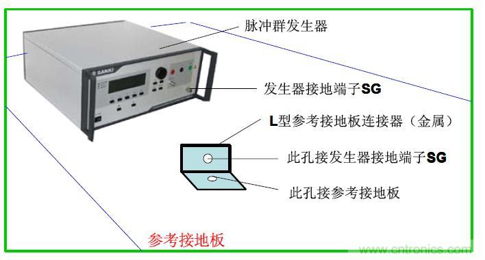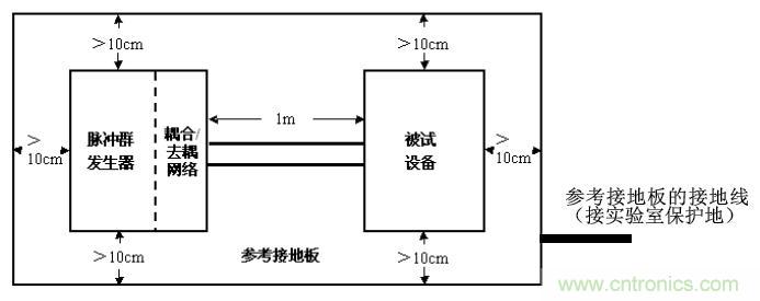 ③ 試驗(yàn)儀器(包括脈沖群發(fā)生器和耦合/去耦網(wǎng)絡(luò))放在參考接地板上。試驗(yàn)儀器用盡可能粗短的接地電纜與參考接地板連接,并要求在連接處的阻抗盡可能地小。