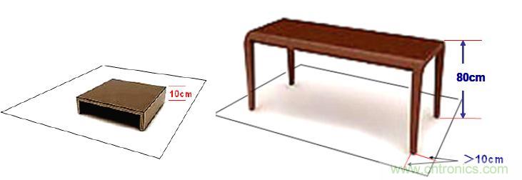 ④ 落地的試品要用0.1±0.01m的絕緣座隔開(kāi)后放在參考接地板上。對(duì)于臺(tái)式試品,應(yīng)放置在離參考接地板高度為0.8±0.08m的木頭臺(tái)子上,試品(或試驗(yàn)臺(tái)子)距參考接地板邊緣的最小尺寸滿足項(xiàng)①(0.1m)的規(guī)定。