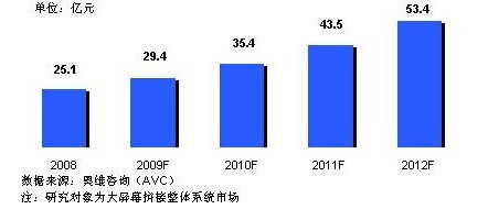 屏幕拼接市場(chǎng)已經(jīng)進(jìn)入快速成長(zhǎng)期,據(jù)奧維咨詢(AVC)《中國(guó)大屏幕拼接市場(chǎng)研究報(bào)告》顯示,2008年中國(guó)市場(chǎng)規(guī)模約為25.1億元,2009年雖然遭遇經(jīng)濟(jì)大環(huán)境的影響,預(yù)計(jì)仍將增長(zhǎng)17%左右,市場(chǎng)規(guī)模將達(dá)29.4億元。市場(chǎng)的成長(zhǎng)主要得益于國(guó)家對(duì)能源、交通等基礎(chǔ)建設(shè)的大規(guī)模投入,以及09年全運(yùn)會(huì)、10年世博會(huì)、亞運(yùn)會(huì)等大型賽會(huì)事的拉動(dòng)。