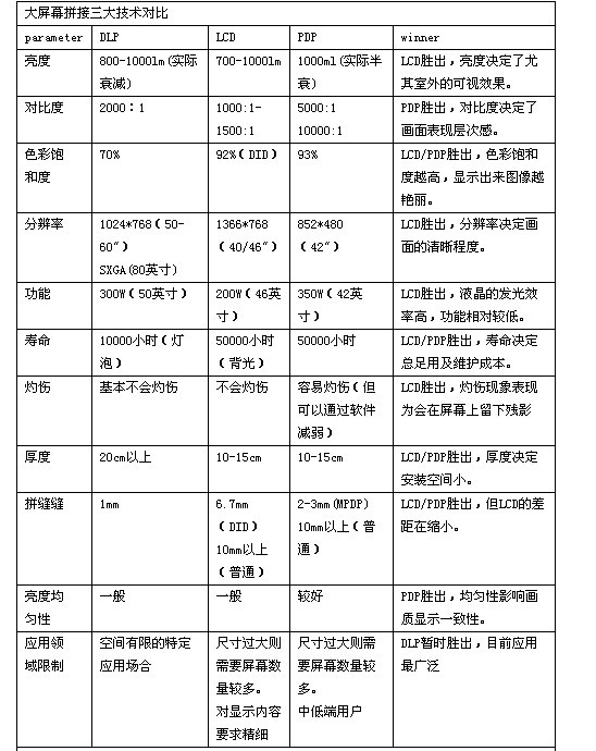從以下對(duì)比表不難發(fā)現(xiàn),從技術(shù)層面來(lái)看,LCD技術(shù)占有綜合優(yōu)勢(shì)的地位,主要弱勢(shì)是拼接縫較寬,而DLP主要優(yōu)勢(shì)則在拼接縫最小,在色彩表現(xiàn)、分辨率、壽命等方面都有著較為明顯的缺陷。PDP則在防灼傷、分辨率方面相對(duì)較弱。