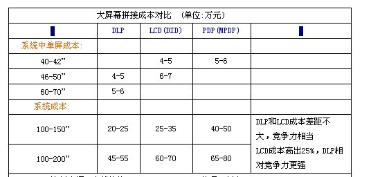 從總體系統(tǒng)分析,100-150”系統(tǒng)中,DLP平均成本為20~25萬(wàn)元左右,而LCD和DLP的差距已經(jīng)縮小到10萬(wàn)元以內(nèi),成本競(jìng)爭(zhēng)力基本相當(dāng)。在150”以上超大拼接系統(tǒng)中,LCD的成本要高出DLP大約25-30%,而MPDP更是要高出30%以上,這一領(lǐng)域DLP的成本競(jìng)爭(zhēng)力優(yōu)勢(shì)比較明顯。