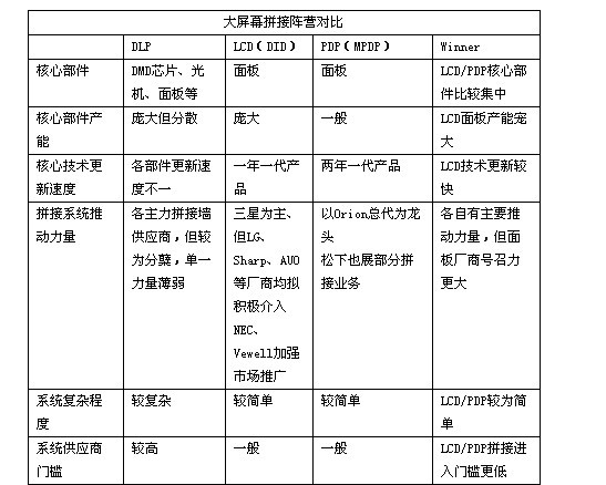 以LCD/PDP為代表的平板產(chǎn)業(yè)鏈卻有著規(guī)模龐大且集中度高的特點(diǎn),面板廠商作為整個(gè)產(chǎn)業(yè)的主要驅(qū)動(dòng)力量,很好的扮演了大屏幕拼接技術(shù)和市場(chǎng)推廣者的角色。雖然暫時(shí)只有Samsung作為主力推動(dòng)DID LCD拼接技術(shù)的力量,但是包括LG、Sharp、CMO、AUO等在內(nèi)全球主力面板廠商都已開(kāi)始積極布局專業(yè)公共顯示面板及拼接顯示面板。LCD產(chǎn)業(yè)由于可以橫跨零售、商用、大屏幕拼接等諸多領(lǐng)域,規(guī)模更大,系統(tǒng)效率也更高一些。