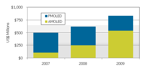 根據(jù)DisplaySearch最新出版OLED出貨及預(yù)測(cè)報(bào)告指出,2009年全球OLED面板出貨金額達(dá)8億2千6百萬(wàn)美元,較去年增長(zhǎng)35%,主要增長(zhǎng)因素來(lái)自于手機(jī)主要屏幕對(duì)AMOLED面板需求增加。2009年手機(jī)市場(chǎng)對(duì)AMOLED面板需求增加不只貢獻(xiàn)了全球OLED出貨提高,同時(shí)也使得AMOLED產(chǎn)值首度超越PMOLED;根據(jù)DisplaySearch調(diào)查數(shù)據(jù)表示2009年AMOLED面板出貨金額為5億3千7百萬(wàn)美元,PMOLED則為2億9千1百萬(wàn)美元。由于智能型手機(jī)要求大尺寸主動(dòng)式面板趨勢(shì),取代了許多翻蓋式手機(jī)設(shè)計(jì),而翻蓋式手機(jī)次屏多是采用PMOLED面板,也因此對(duì)于PMOLED面板需求產(chǎn)生了一定影響。