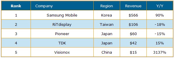 從供貨商排名來(lái)看,Samsung Mobile Display遙遙領(lǐng)先其它廠商以5億6千6百萬(wàn)美元居冠,年成長(zhǎng)率高達(dá)90%;臺(tái)灣錸寶科技(RiTdisplay)以1億零6百萬(wàn)美元排名第二,較去年下滑18%;Pioneer位居第三,出貨金額為6千萬(wàn)美元較去年下滑15%;TDK出貨金額較2008年提高15%,維持第四名地位;中國(guó)大陸廠商維信諾(Visionox)出貨金額較去年成長(zhǎng)達(dá)1千5百萬(wàn)美元,排名第五。