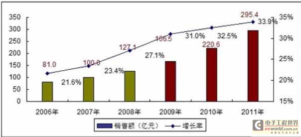 圖1 2006-2011年中國(guó)便攜醫(yī)療電子市場(chǎng)規(guī)模與預(yù)測(cè)