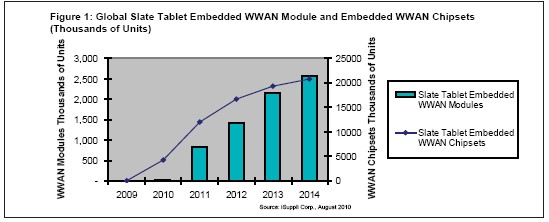 iSuppli公司預(yù)測(cè),到2014年,slate型平板電腦市場(chǎng)的嵌入WWAN芯片組出貨量將達(dá)到2070萬(wàn)個(gè),而2009年幾乎是零。同時(shí),到2014年slate市場(chǎng)的嵌入WWAN模塊出貨量將達(dá)到210萬(wàn)個(gè),而2009年出貨量也幾乎是零,其間的復(fù)合年度增長(zhǎng)率高達(dá)498.4%。所謂的slate型平板電腦,包括蘋(píng)果公司的iPad。