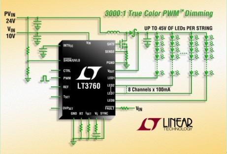 凌力爾特公司 (Linear Technology Corporation) 推出8通道LED驅(qū)動(dòng)器LT3760,該器件采用一個(gè)升壓型DC/DC控制器,每個(gè)通道能驅(qū)動(dòng)高達(dá)45V的100mA LED 串。其內(nèi)部60V、1MHz DC/DC升壓型控制器設(shè)計(jì)成面向多達(dá)80個(gè)白光LED的恒定電流LED驅(qū)動(dòng)器。LT3760用一個(gè)12V輸入可以驅(qū)動(dòng)8個(gè)通道,每通道多達(dá)10個(gè)串聯(lián)的100mA 白光LED,同時(shí)提供超過92% 的效率。其多通道能力使該器件非常適用于中型和大型TFT-LCD背光照明應(yīng)用。其6V至40V 的輸入電壓范圍使該器件非常適用于汽車、航空電子設(shè)備、HDTV 和工業(yè)顯示器應(yīng)用。