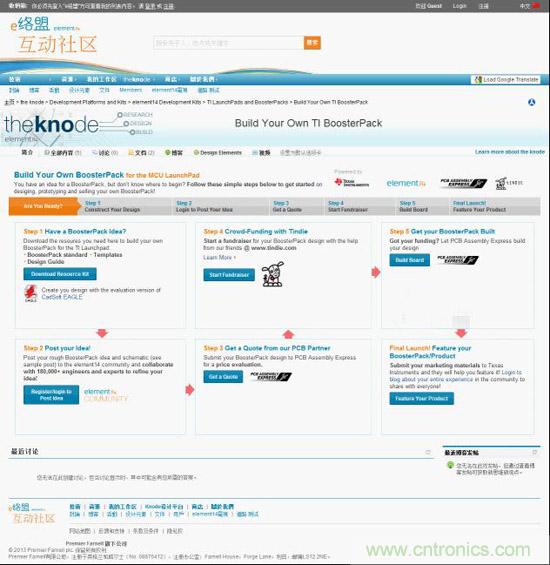 e絡(luò)盟母公司Premier Farnell集團(tuán)首席技術(shù)官沈洪先生表示:“我們很高興能夠在強(qiáng)大的e絡(luò)盟社區(qū)推出這個行業(yè)首屈一指的網(wǎng)站平臺。e絡(luò)盟社區(qū)現(xiàn)擁有20萬社區(qū)成員,通過將設(shè)計工程師、業(yè)余愛好者及供應(yīng)商合作伙伴集中到一個平臺,以便他們進(jìn)行直接交流,極大地縮短了新品上市時間。我們極力鼓勵并支持用戶開發(fā)針對TI MCU LaunchPad的擴(kuò)展板。我們將幫助他們進(jìn)行概念設(shè)計、產(chǎn)品開發(fā)、原型設(shè)計,直至最后投入市場。”