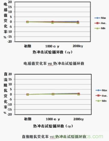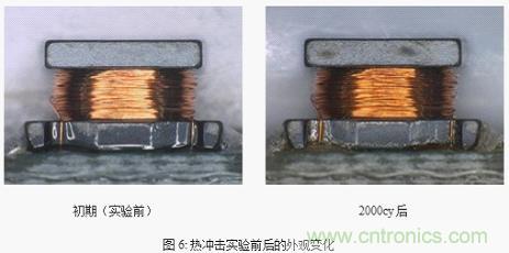 圖6、7所示為關(guān)于LQH43NN222K03在-40℃↔+105℃/2000循環(huán)熱沖擊試驗前后的外觀照片,主要電氣特性的變化。在熱沖擊試驗后,沒有發(fā)現(xiàn)鼓形磁芯的開裂及電線斷線等不合格現(xiàn)象。另外,關(guān)于主要的電氣特性,變化率也控制在±1%以內(nèi),是滿足了車載用元器件性能要求的產(chǎn)品。