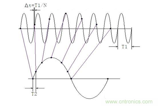 可以看到,等效采樣方法在輸入信號一個周期內(nèi)僅采樣一個點且每個周期采樣的相位有遞增關(guān)系(圖1中△t),調(diào)整這個遞增相位可以達到調(diào)整相位分辨率的目的。