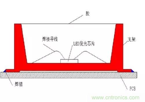 眾所周知,回流焊爐內(nèi)一般會有240°的高溫。如果環(huán)氧樹脂膠TG點過低,或封裝過程有潮氣吸入,高溫會導(dǎo)致膠體非線性急劇膨脹,導(dǎo)致LED芯片焊線拉斷破壞失效。另外高溫會通過支架管腳將熱量快速傳導(dǎo)到芯片,造成芯片體龜裂碎化失效的可能性增加。而這種問題是最可怕的,一般在工廠老化測試時也不會出現(xiàn)問題,經(jīng)過運輸?shù)娇蛻舳嗽偈褂靡欢螘r間問題就會逐步暴露出來。
