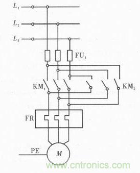 在眾多的操作系統(tǒng)中均要求電動(dòng)機(jī)能夠?qū)崿F(xiàn)正反轉(zhuǎn)給操作,從電動(dòng)機(jī)的工做原理中可知,需將三相電源中的任意兩個(gè)進(jìn)行對(duì)調(diào),就能實(shí)現(xiàn)電動(dòng)機(jī)的反向運(yùn)轉(zhuǎn),因此電動(dòng)機(jī)實(shí)現(xiàn)正反轉(zhuǎn)的實(shí)質(zhì)便是電源進(jìn)線的調(diào)換。但若僅調(diào)換進(jìn)線,容易導(dǎo)致電源短路,因此必須設(shè)置互鎖,圖2是三相異步電動(dòng)機(jī)正反轉(zhuǎn)的原理設(shè)計(jì)圖,圖中KM1和KM2均是交流接觸器主觸頭,當(dāng)KM1吸合時(shí),KM2交流接觸器主觸頭就會(huì)斷開,然后便可實(shí)現(xiàn)電機(jī)的正轉(zhuǎn)。若是斷開交流接觸器主觸頭KM1,KM2就會(huì)吸合,此時(shí)電動(dòng)機(jī)則會(huì)實(shí)現(xiàn)反轉(zhuǎn),圖中的FU1主要用于防止電源短路,圓形代表電機(jī)M。
