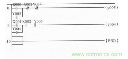 在圖3梯形圖中,PLC外部按鈕所控制的常開觸點(diǎn)主要是左母線的第一等級(jí)以及第二等級(jí)的X001觸點(diǎn)和X002觸點(diǎn),只需按鈕便可使得X000或X001任意一個(gè)常開觸點(diǎn)閉合,輸出繼電器Y005或繼電器Y004就能通過相應(yīng)線路形成閉合回路,進(jìn)而使常開接觸點(diǎn)Y005或Y004實(shí)現(xiàn)自鎖功能同時(shí)實(shí)現(xiàn)電動(dòng)機(jī)的正反轉(zhuǎn)。停止通過PLC外部的按鈕實(shí)現(xiàn),按鈕通過釋放X002常開接觸點(diǎn),使得繼電器斷電引發(fā)電動(dòng)機(jī)停止運(yùn)轉(zhuǎn)。