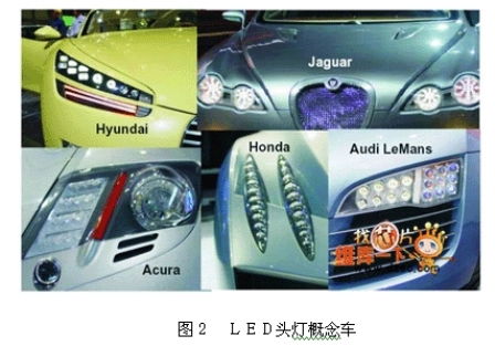 從LED的應(yīng)用歷史來看,早在1992年時(shí)已經(jīng)有LED應(yīng)用于第三剎車燈上的先例;而在2000年時(shí)則進(jìn)一步的應(yīng)用于尾燈、轉(zhuǎn)向燈與剎車燈;到了2002年Audi?。粒嘎氏葘ⅲ蹋牛墓庠粗糜谇爸脽艟邇?nèi)作為日行燈,開啟了設(shè)計(jì)師與工程師們?cè)谇爸脽艟叩南胂罂臻g。在之后的許多國際車展上都可以看到LED作為前照燈源的概念車,如圖2所示。