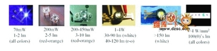 不同的應(yīng)用層面,其總亮度需求也隨之不同,以內(nèi)部照明而言大約需要80流明的亮度,一般選用表面黏著型(SMT)的封裝,單體封裝約2流明輸出,效率可達(dá)15 ̄20lm/W。以第三剎車燈而言大約需要30lm的亮度,一般選用炮彈型的封裝結(jié)構(gòu)(φ=5mm),單體封裝亮度約4流明,效率可達(dá)20 ̄40lm/W。
