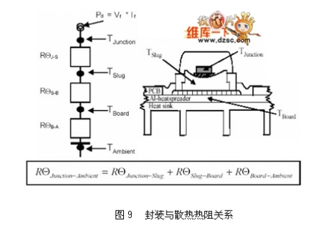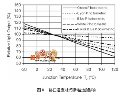 散熱設(shè)計(jì)是LED光源區(qū)別于傳統(tǒng)光源的課題之一。傳統(tǒng)燈具產(chǎn)生的熱遠(yuǎn)高于LED,但傳統(tǒng)燈具不會(huì)因?yàn)楦邷囟档推涔庠摧敵瞿芰?,但LED的光輸出卻會(huì)隨著本身接口(Junction, PN接口)溫度的升高而下降,如圖8所示。而其產(chǎn)生的熱如何散除到外界環(huán)境與其封裝結(jié)構(gòu)材料息息相關(guān),牽涉到使用的散熱材料與相關(guān)外型,關(guān)系如圖9所示,其中熱阻的概念,代表輸入W功率時(shí),需要提高多少K溫度才足以散熱。以現(xiàn)有的封裝技術(shù)最高可允許LED操作在185℃(Lumiled?。耍玻话阋?yàn)榉庋b膠材的關(guān)系,可允許的操作溫度約在125℃,除了考慮光源輸出效率之外,亦考慮封裝膠材的變質(zhì)(樹脂類材料在高溫有老化現(xiàn)象)。