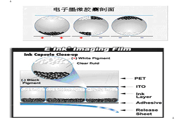 E-Ink的電子紙由電子墨水及兩片基板所組成:第一部分是電子墨水,有時(shí)被稱為“前基板(front plane)”;二是使電子墨水生成文本和圖像所需要的電子設(shè)備組合,包括控制部分和顯示部分,被稱為“背基板(backplane)”。背基板上面涂有由無數(shù)微小的透明顆粒組成的電子墨水,顆粒直徑只有人的頭發(fā)絲的一半大小。電子墨水是一種加工成薄膜狀的專用材料,與電子顯示設(shè)備結(jié)合在一起使用,是化學(xué)、物理學(xué)和電子技術(shù)的綜合應(yīng)用。電子墨水由數(shù)百萬個(gè)尺寸極小的微膠囊構(gòu)成,直徑與頭發(fā)絲相當(dāng)。每一個(gè)微膠囊中含有帶正電荷的白色粒子和帶負(fù)電荷的黑色粒子,它們懸浮在清潔的液體中。 如圖1所示,電子墨水薄膜的頂部是一層透明材料,作為電極端使用;底部是電子墨水的另一個(gè)電極,微膠囊夾在這兩個(gè)電極間。微膠囊受負(fù)電場作用時(shí),白色顆粒帶正電荷而移動(dòng)到微膠囊頂部,相應(yīng)位置顯示為白色;黑色顆粒由于帶負(fù)電荷而在電場力作用下到達(dá)微膠囊底部,使用者不能看到黑色。如果電場的作用方向相反,則顯示效果也相反,即黑色顯示,白色隱藏??梢?,只要改變電場作用方向就能在顯示黑色和白色間切換,白色部位對應(yīng)于紙張的未著墨部分,而黑色則對應(yīng)著紙張上的印刷圖文部分。