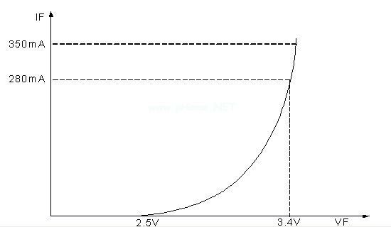 目前的新技術(shù)使LED能夠達(dá)到很高的功率水平,LED的功率能夠達(dá)到1W,甚至有些達(dá)到5W,光效達(dá)到60-85LM/W,這種LED設(shè)備稱(chēng)為高亮LED(HB-LED)。目前我們用在照明上LED都是HB-LED,一般都是選擇1W的LED通過(guò)串并聯(lián)的方式組成大功率LED燈,尤其以串聯(lián)為主。這種LED的為3.4V±2%,正向電流為350mA左右。其-曲線如圖1.1所示。